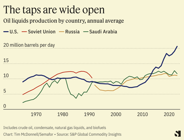 Record-breaking U.S. oil production isn’t just a response to demand, or a matter of companies trying to chase higher crude oil prices as their rivals in OPEC countries continue to cut their production quotas. It’s more the result of the wave of consolidation that has swept through the U.S. shale patch in the last year, like ExxonMobil’s $60 billion acquisition of Pioneer Natural Resources. The larger companies have more engineering resources to squeeze the most oil out of the assets they’ve acquired, per dollar of operating expenses. So production is increasing even though the total number of active drilling rigs in the U.S. is currently 15% below the 2022 average.