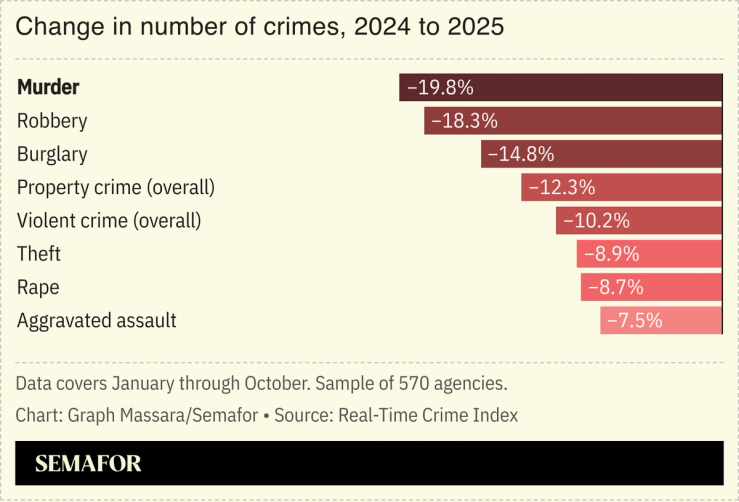 The projected 20% drop in murders from 2024 to 2025, which would be the largest decline ever recorded, furthers a trend that began in 2023; at least 10 cities are set to record the fewest murders since 1970, crime analyst Jeff Asher wrote on his Substack.