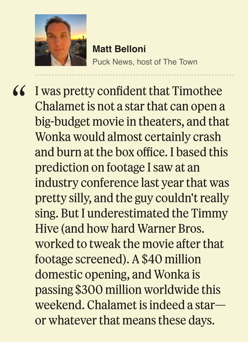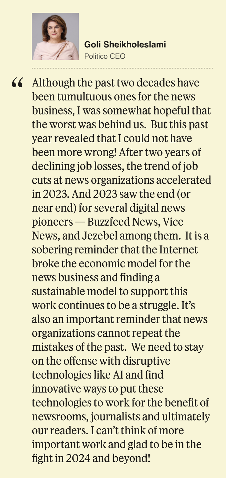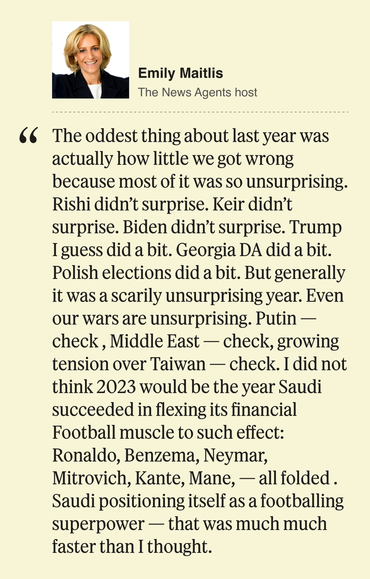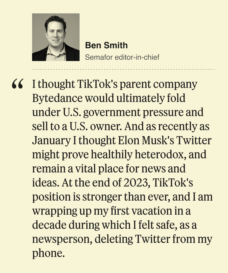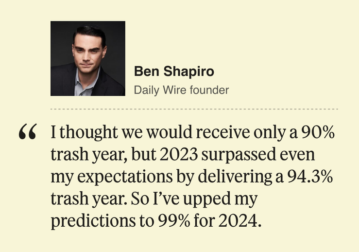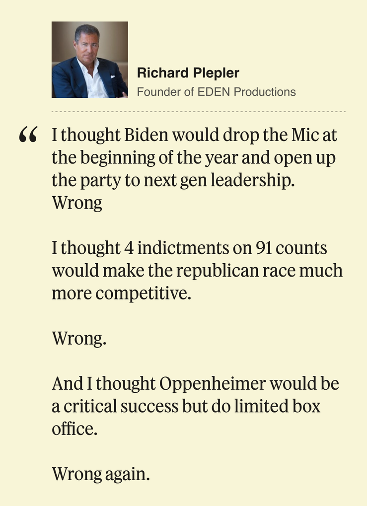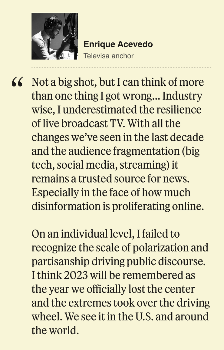 In this spirit, as the year comes to a close, we wanted to ask some of the most interesting Semafor Media readers to look back on their own bold, totally wrong predictions for 2023. We asked people like Barry Diller, Mark Cuban, Richard Pleppler, Sunny Hostin, Radhika Jones, Janice Min, Ben Shapiro, and many more about what narratives went sideways, and which assumptions they had that just didn’t pan out.