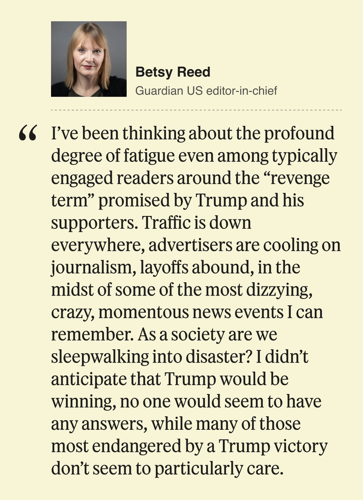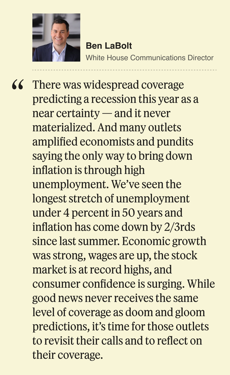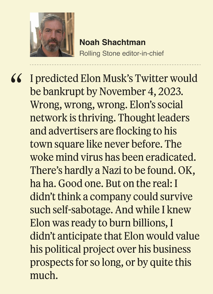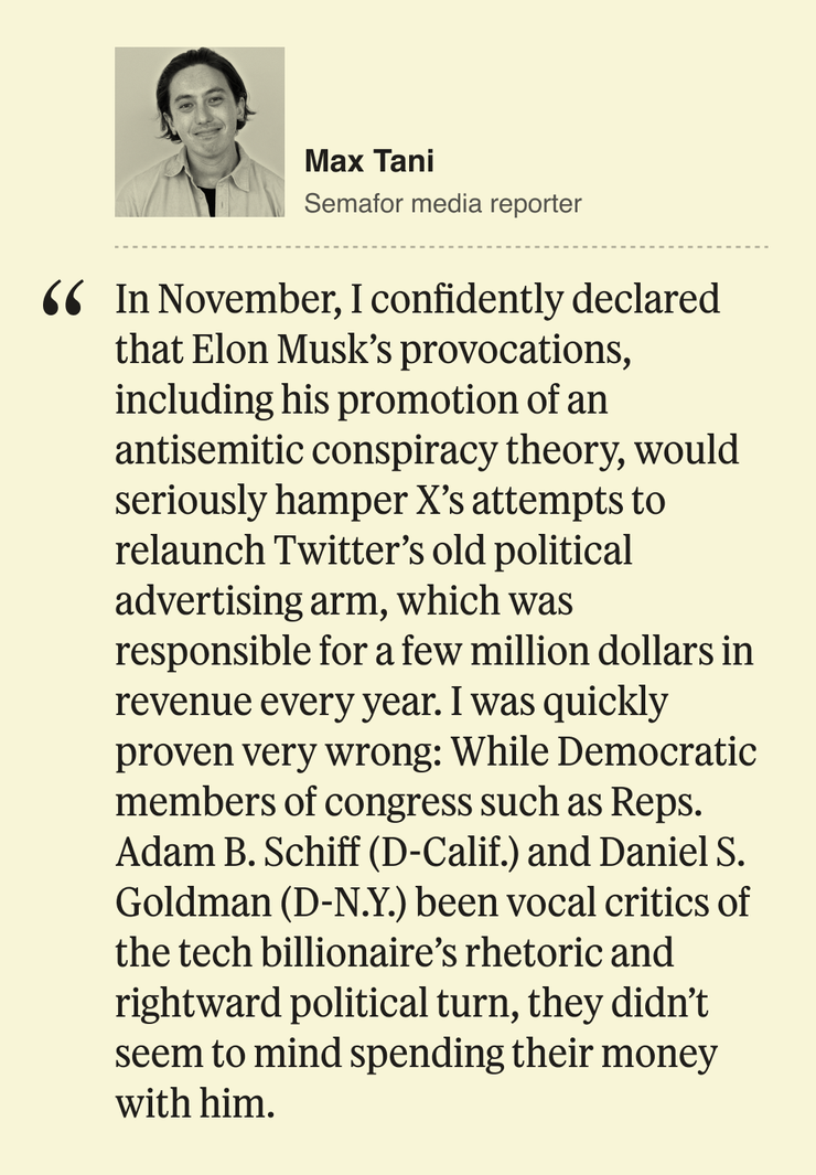 The responses we got back were as varied as the stories that dominated news in 2024: Some, people like Televisa anchor Enrique Acevedo, were reflective on personal shortcomings that led to failures in their newsgathering. Others, given the opportunity, shared what they thought we in the news media got wrong; no one was quicker to respond to my inquiry than Ben LaBolt, the White House communications director who said journalists’ incorrect, needlessly pessimistic economic forecasts warranted some reflection on future coverage. Despite our best efforts, Ben Smith and I also struck out a few times: almost immediately after declaring Twitter’s push into political advertising to be a bust, Democrats surprised me with their willingness to spend money on Elon Musk’s platform.