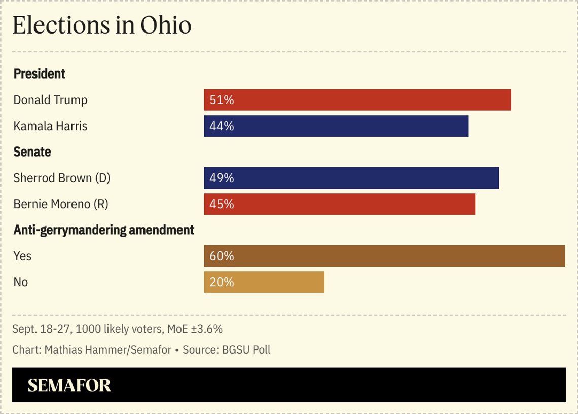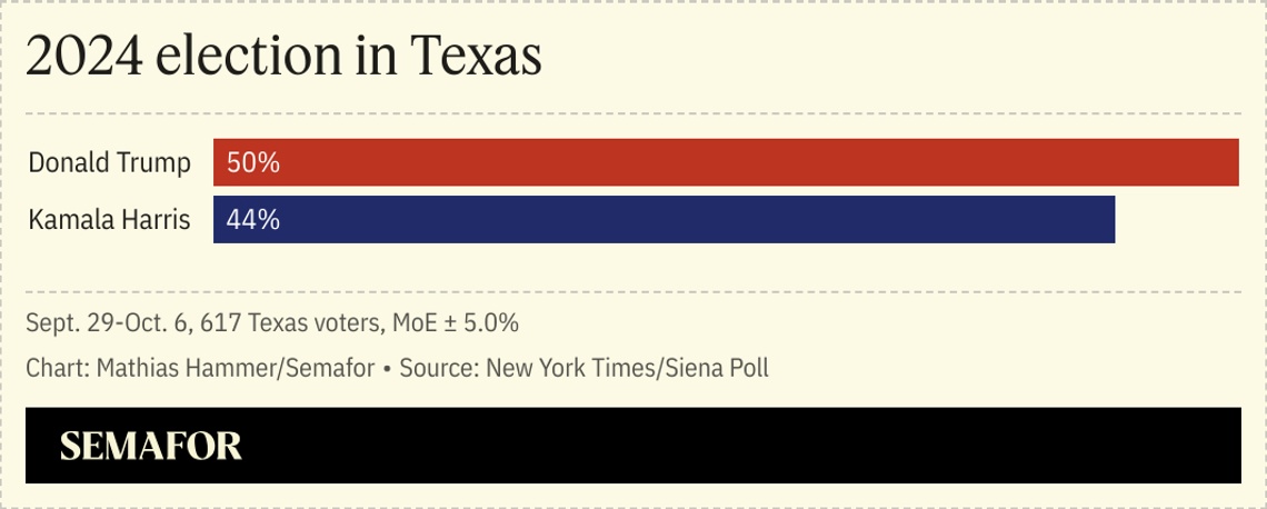 Polls Asking voters who they think will win an election: It’s enlightening, but it doesn’t always mean much. According to CBS News’s polling, most voters spent 2016 expecting Hillary Clinton to win. According to Monmouth’s polling, a slight plurality of voters expected a Trump victory in September 2020 even as the same respondents gave Joe Biden a solid lead in the horse race numbers. Harris has held an advantage every time the question gets asked this year — in this case, in a poll that finds a small single-digit lead for her in the popular vote. But more voters think their neighbors will vote for Trump. What explains it? For the first time, the Democratic nominee against Trump is drawing huge crowds, which Clinton couldn’t in 2016, and Biden didn’t try to in 2020. The perception that Harris will win is annoying enough to some Trump allies that they’ve urged people to watch betting markets, where Elon Musk’s encouragement led to more people buying Trump, putting him ahead.  Here’s the short story of modern Democratic ambitions in Texas. In 2016, Hillary Clinton outperformed a generation of Democrats in the state’s biggest cities and suburbs and lost by single digits. In 2020, Joe Biden did even better in Texas’s population centers, but declined with Latino voters in the Rio Grande Valley. In 2024, the most ambitious Democrats just want a result close enough to ease Colin Allred’s path in the Senate race. Harris is looking more like Biden than Clinton, running 10 points ahead of her with white voters and dominating among college-educated voters. She runs out of road because she barely wins Latino voters, by 6 points, a 21-point decline from Clinton.  JD Vance’s 2022 Senate race gave Republicans an expensive but effective playbook for this year. Vance trailed all summer and moved ahead after Labor Day, once a messy primary was forgotten and Republican groups began outspending Democrats. Moreno, who sailed through his primary, has got more allies making more ad reservations than Vance ever did, including $30 million in spending from the pro-Moreno crypto industry super PAC Fairshake. But Moreno continues to underperform with independents. (One possible factor here: The generic Fairshake ads about jobs aren’t very memorable.) The Democrat-backed redistricting initiative is succeeding because those same independents support it, and because Republicans haven’t broken hard against it. Ads @DonaldJTrumpforPresident/YouTube- Harris for President, “Big Family.” The Alabama Supreme Court’s ruling that temporarily halted IVF treatments spurred a Republican panic — a quickly-passed state bill to clarify IVF’s legality, a surprise Trump promise for government-backed free IVF at the national level. Democrats didn’t stop talking about the topic, and recruited Latorya Beasley, one of the Alabamian women blocked from an IVF appointment after the decision. She joined Democrats at this year’s State of the Union, and she blames the GOP squarely for what happened to her: “Donald Trump overturning Roe v. Wade stopped us from getting the family we wanted.” Democratic ads about abortion rights tend to star women who want families, and the IVF topic has given them the strongest material.